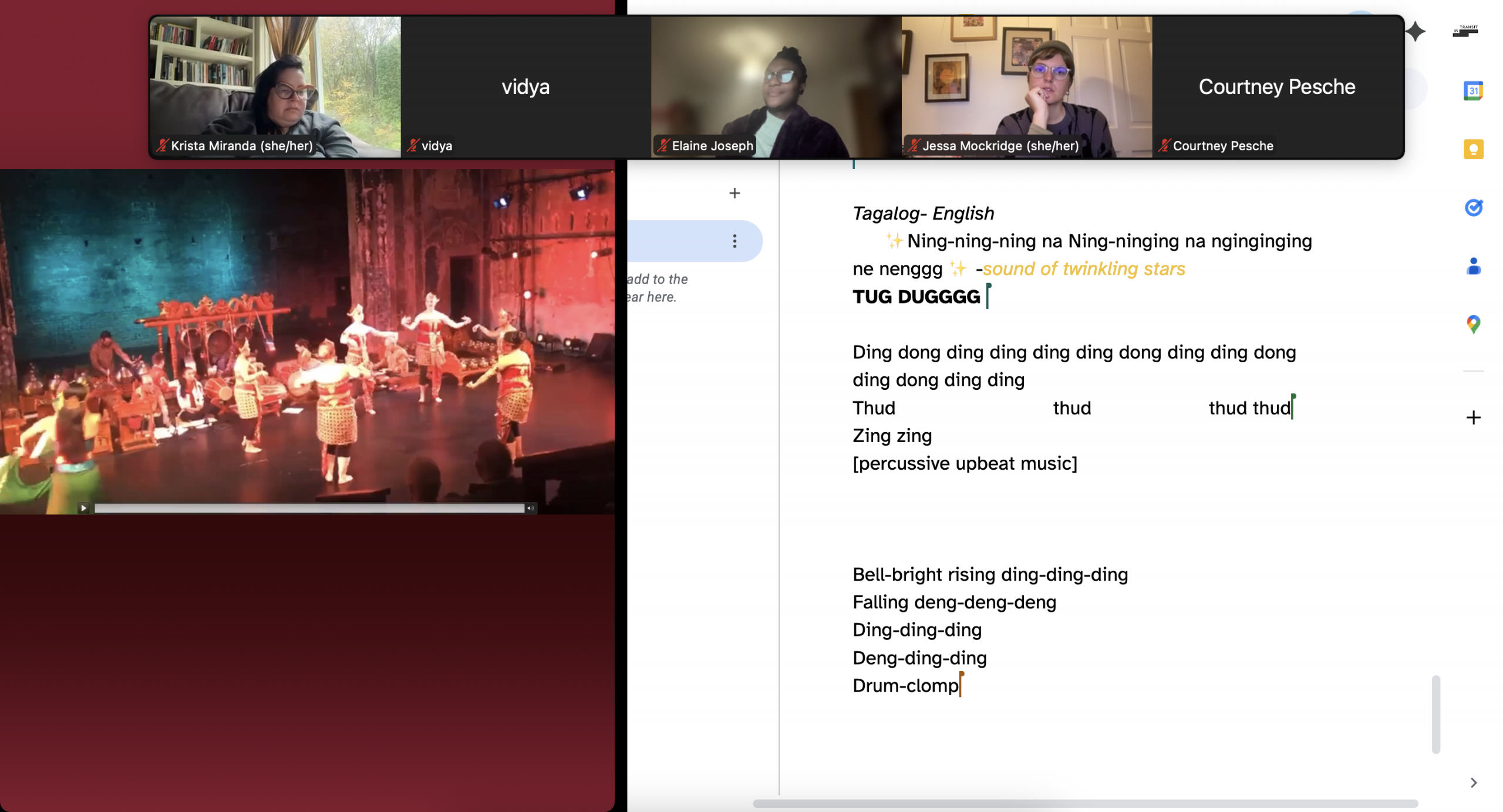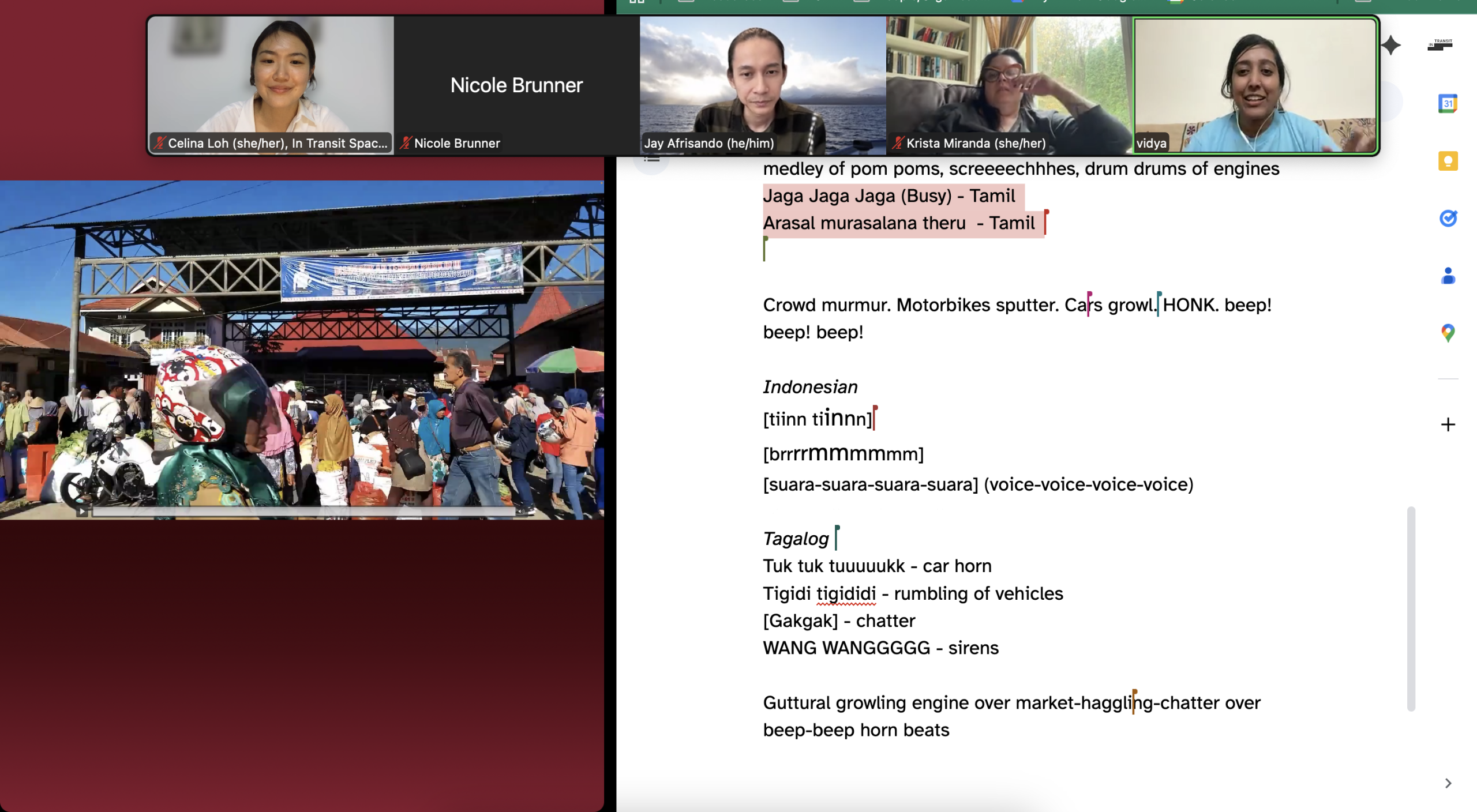 We began by listening to everyday sounds from Southeast Asia and noticing how they are interpreted differently across countries. Participants co-created captions collaboratively in a shared Google Doc, allowing everyone to see, edit and respond in real time. They experimented with onomatopoeia, font size, layout, timing and emphasis, noticing how even subtle changes could alter tone, emotion and interpretation. As captions emerged in Tamil, Filipino, Thai and other linguistic contexts, the group began to reflect on how sound is never neutral – it carries cultural humour, rhythm and social cues.